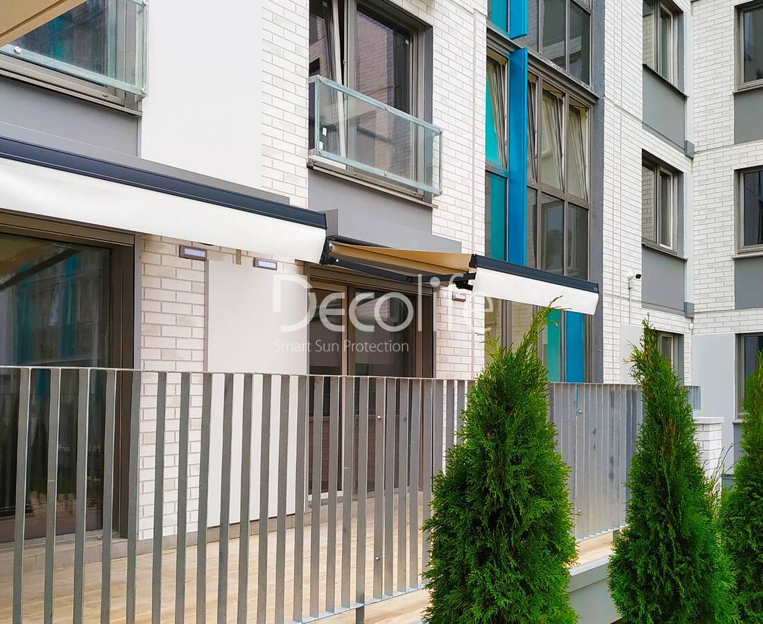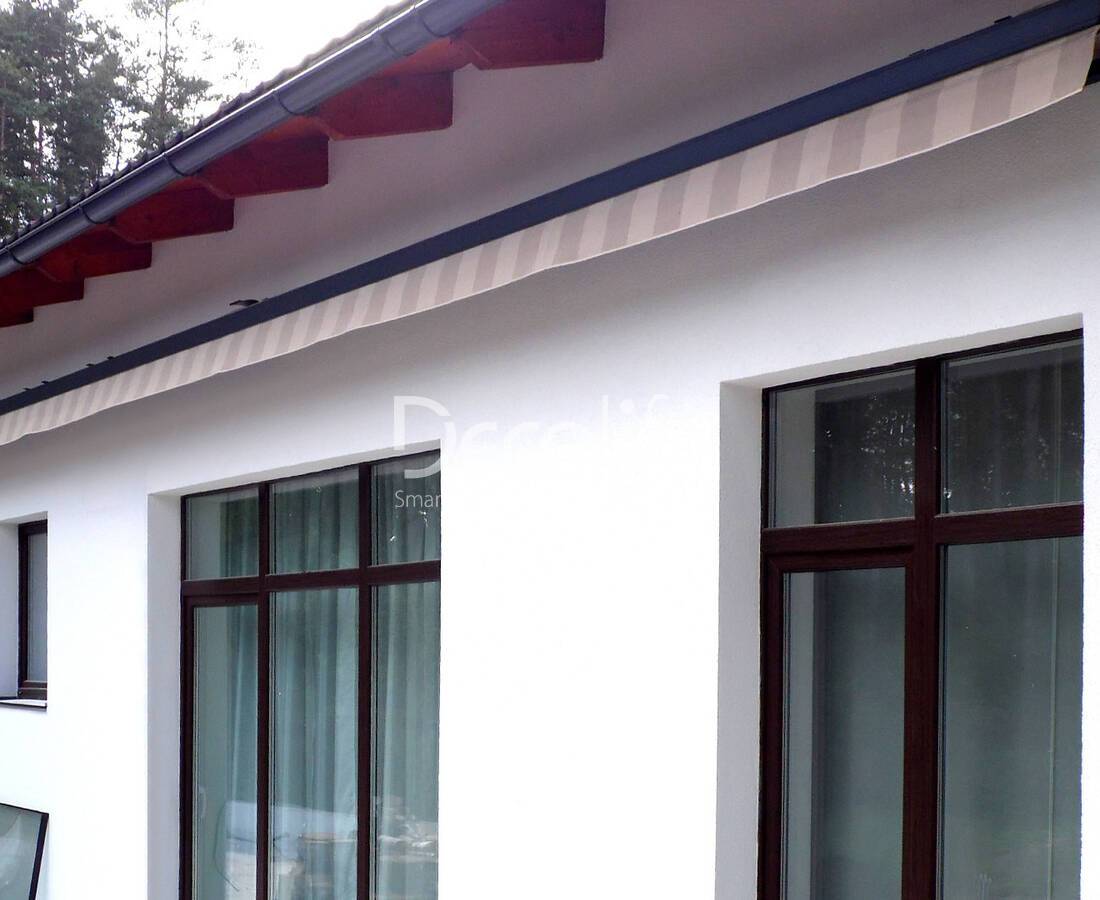 В полукассетных маркизах G2200 и G110 функцию защиты механизма и полотна выполняет специальный кожух. Он не скрыт полностью, а оформлен декоративной панелью. Конструкция эргономична и долговечна, подходит для самых разнообразных объектов.