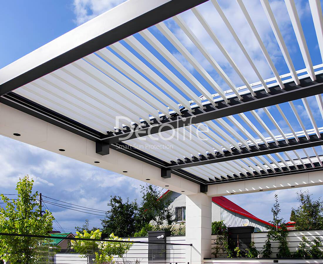 В перголах Bioclimatic предусмотрены смещаемые ламели, открывающие либо закрывающие крышу. В случае дождя элементы герметично закрываются, не пропуская воду внутрь. То же происходит в солнечные дни: ультрафиолетовое излучение блокируется, жара не мешает отдыху за счет затенения пространства. При ясной погоде без осадков ламели можно открыть частично либо полностью.