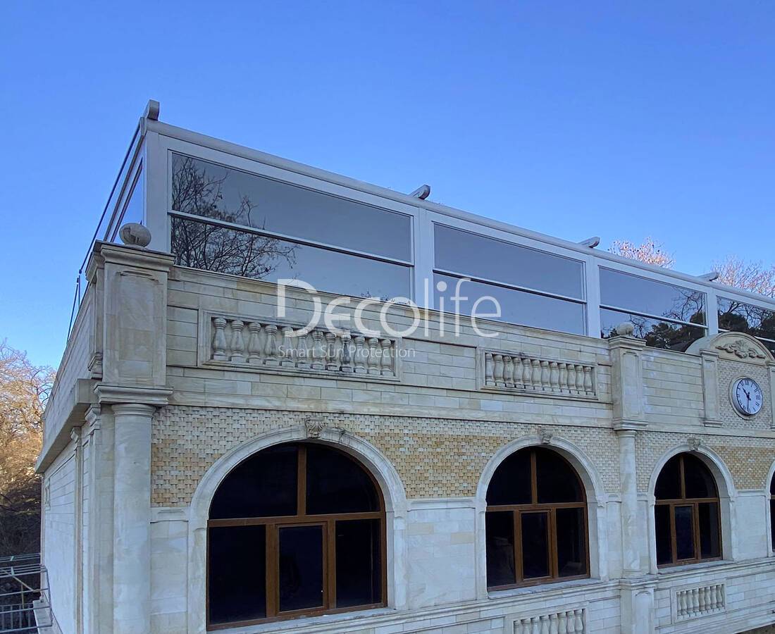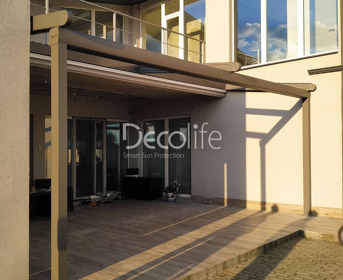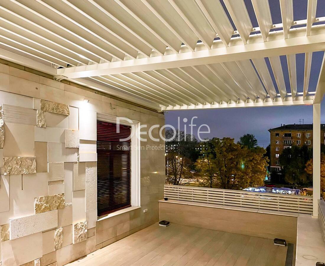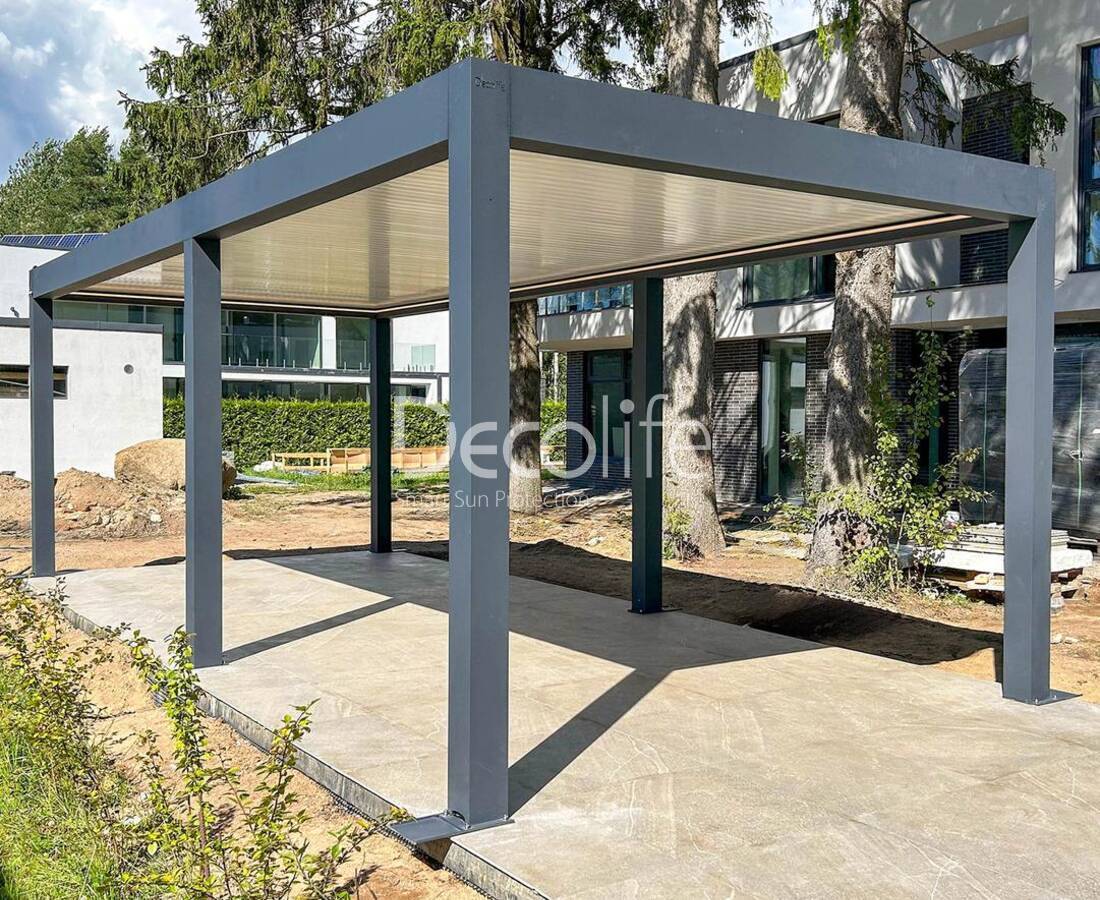 Пергола Decolife Bioclimatic B500-25П + Гильотинное W500 и Раздвижное S150 остекление + Стеклянное ограждение B50 - г. Браслав